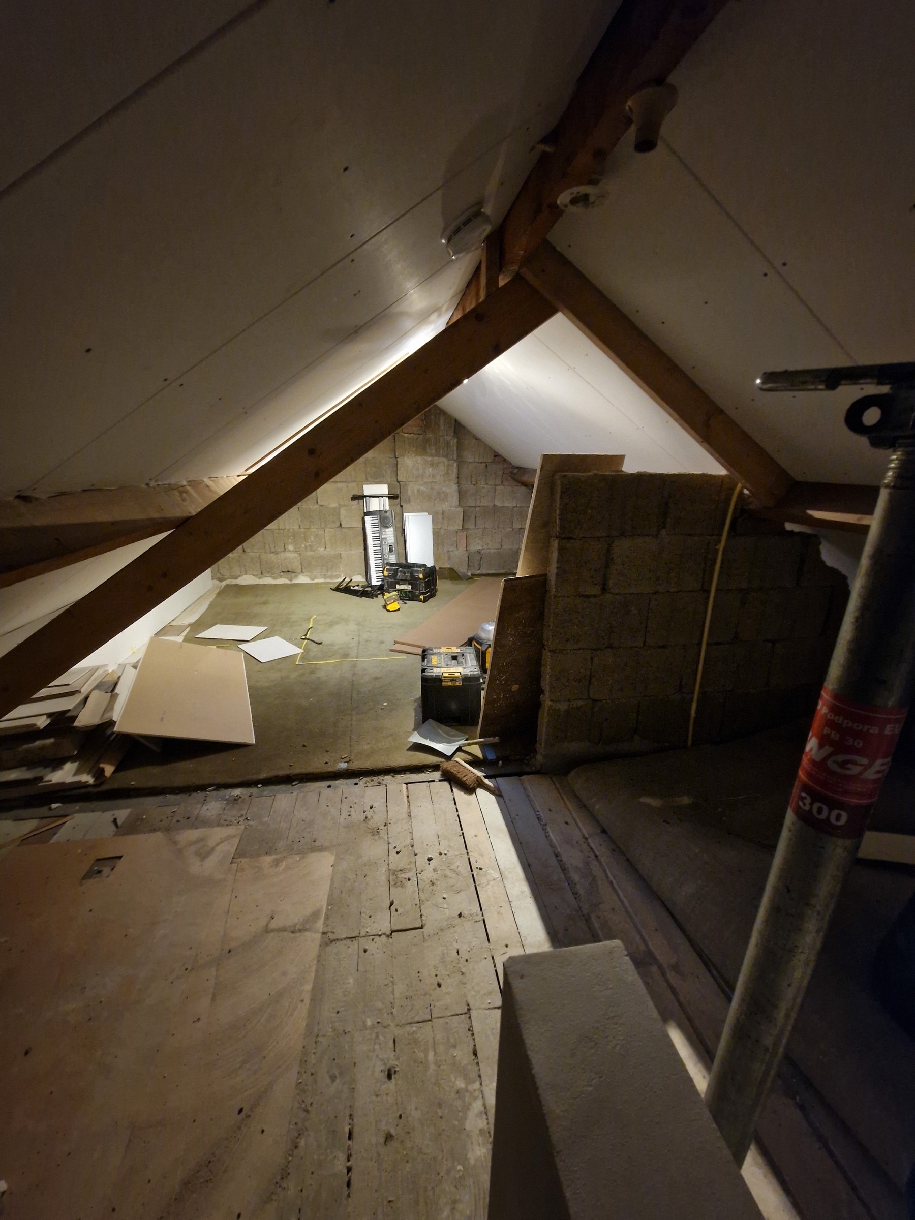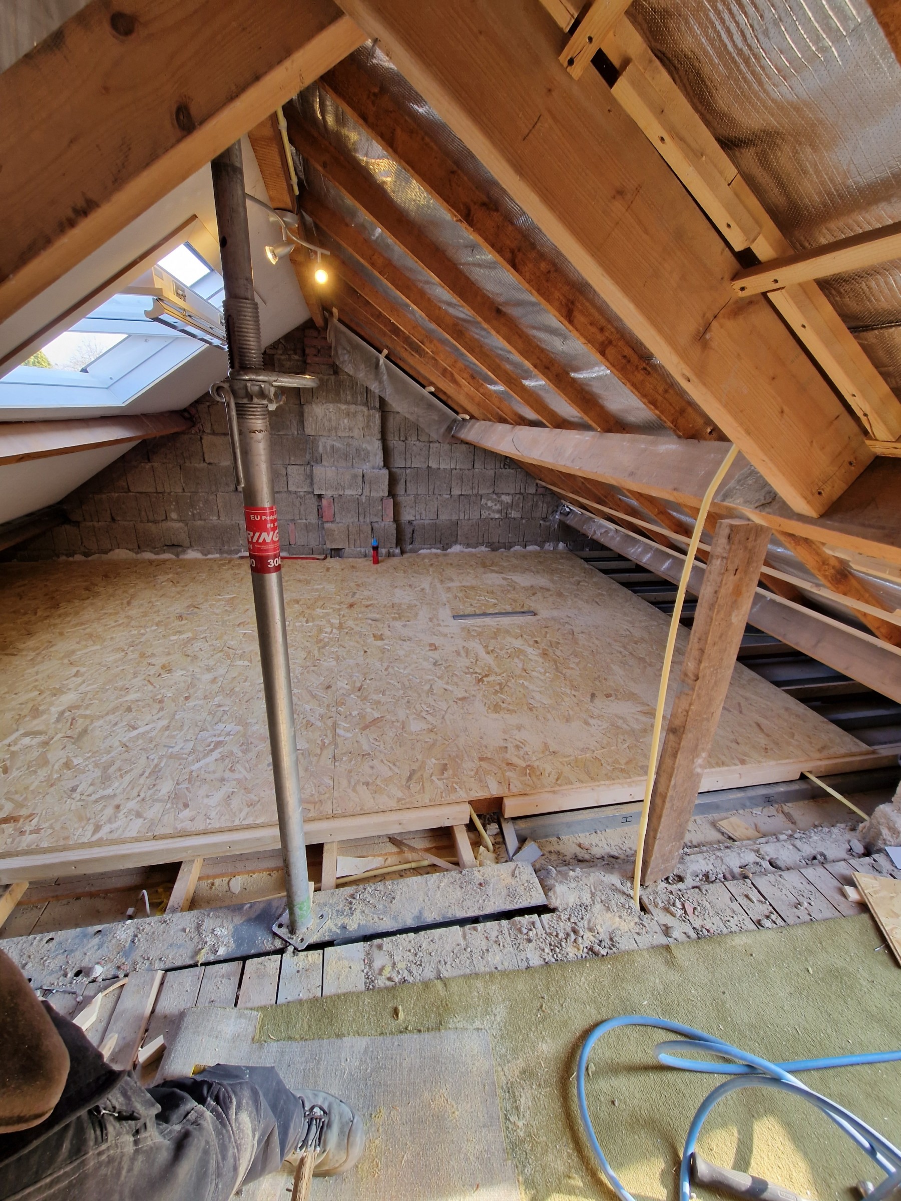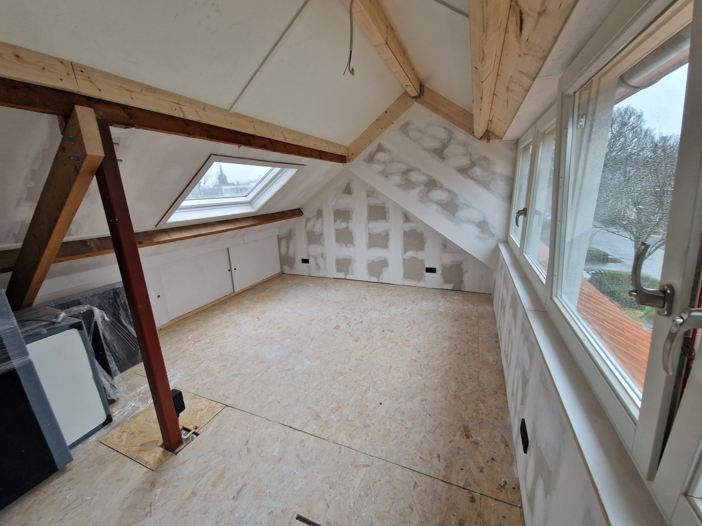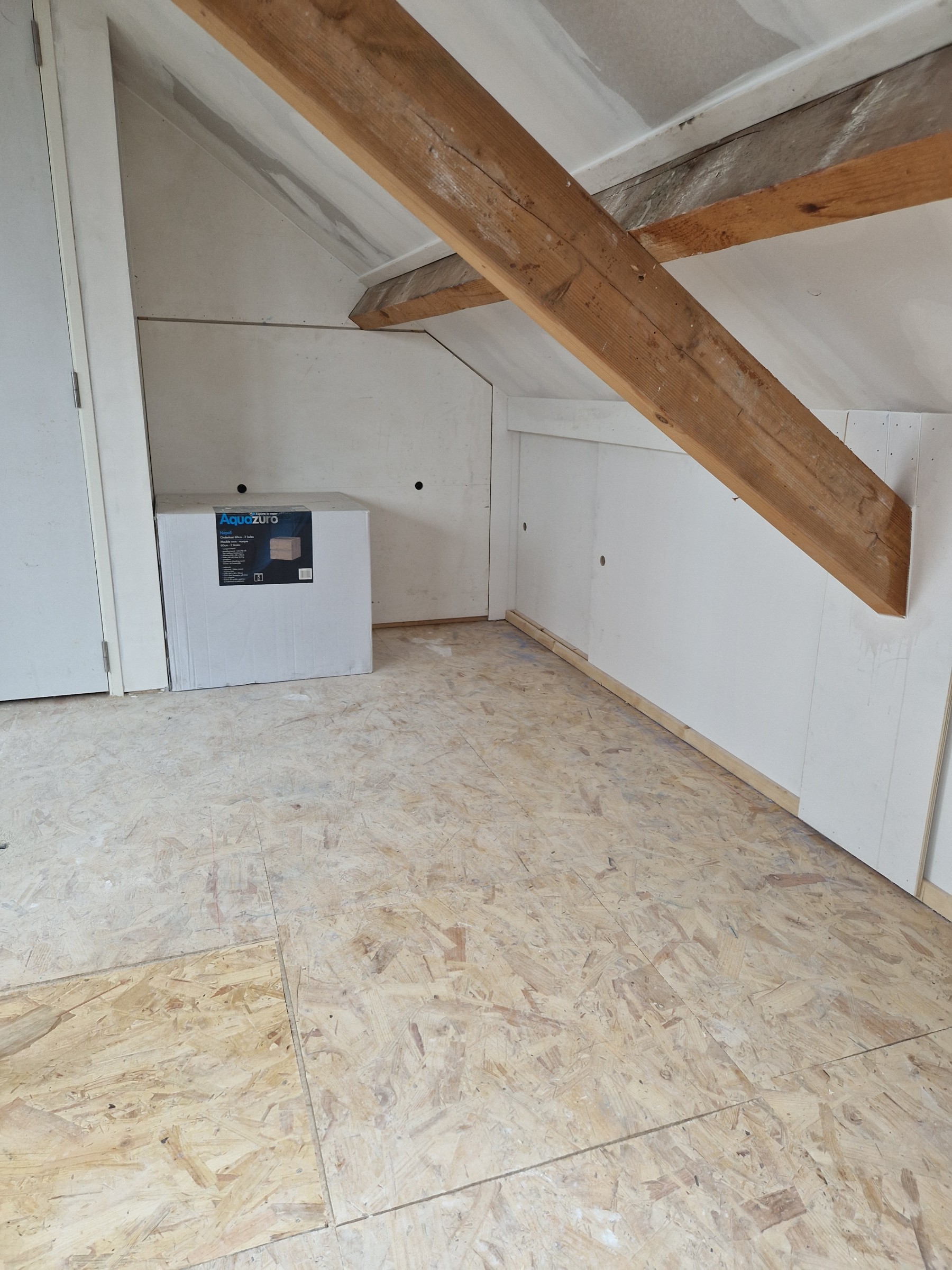 Hier hebben we de zoldervloer uitgevlakt en voorzien van een nieuwe beplating. En van een kleine bergzolder een volwaardige slaapkamer gecreërd doormiddel van een nokverhoging. De ruimte hebben we voorzien van schuifwanden voor het opbergen van spullen, en de ketel netjes weggewerkt.